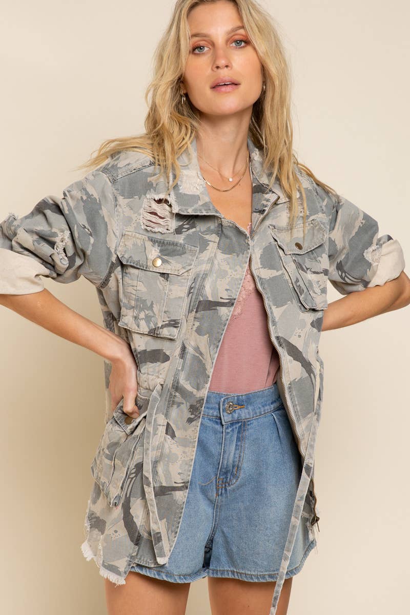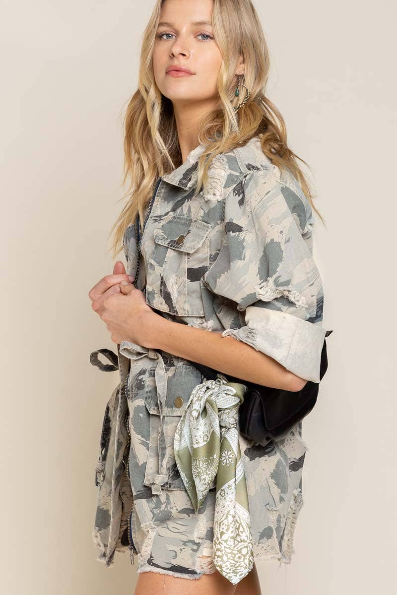 "Sweet Camo Twill Jacket" is the perfect transitional jacket. Designed in a relaxed fit with base olive-ish grey and different green color camo print on the garment. A jacket with hidden placket and zipper closure on center front with distressed collar. Comes with 4 pouch pocket on front with adjustable strap on waistband and finished with distressed detail on hem.