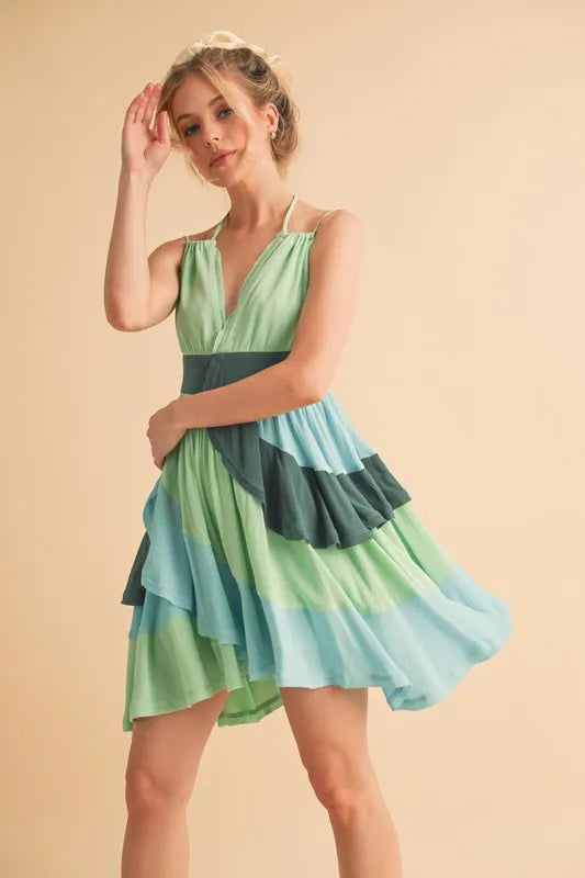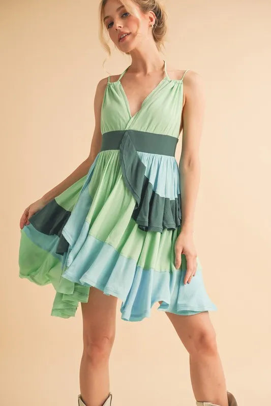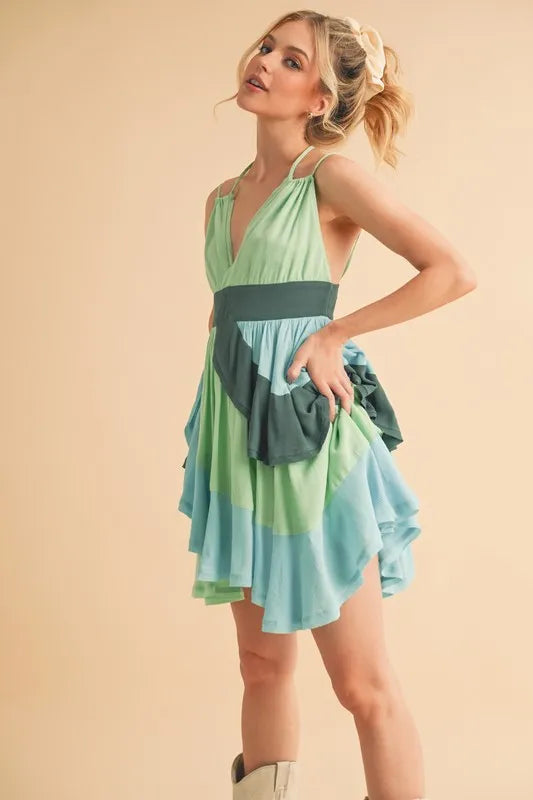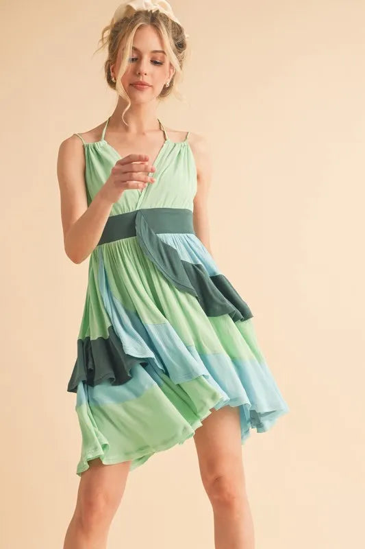 This sleeveless mini dress features trendy color block patterns and playful ruffled details. The combination of style elements creates a fun and eye-catching look. Stand out in style with this ruffled color block sleeveless mini dress.