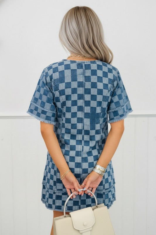 Effortlessly chic meets laid-back cool in this mini dress. The checkered pattern brings timeless appeal, while frayed hems and stitched patchwork details give it that coveted modern edge. The relaxed shift fit flatters every silhouette, making it your go-to piece for casual days that demand style. Dress it up or down, this versatile chambray essential does it all. Cotton/Polyester