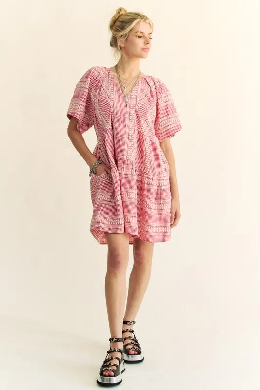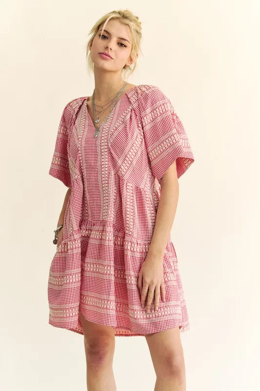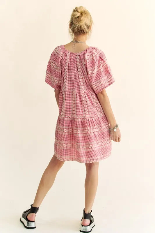 Embroidered Stripe Ruffled Gingham Mini Dress