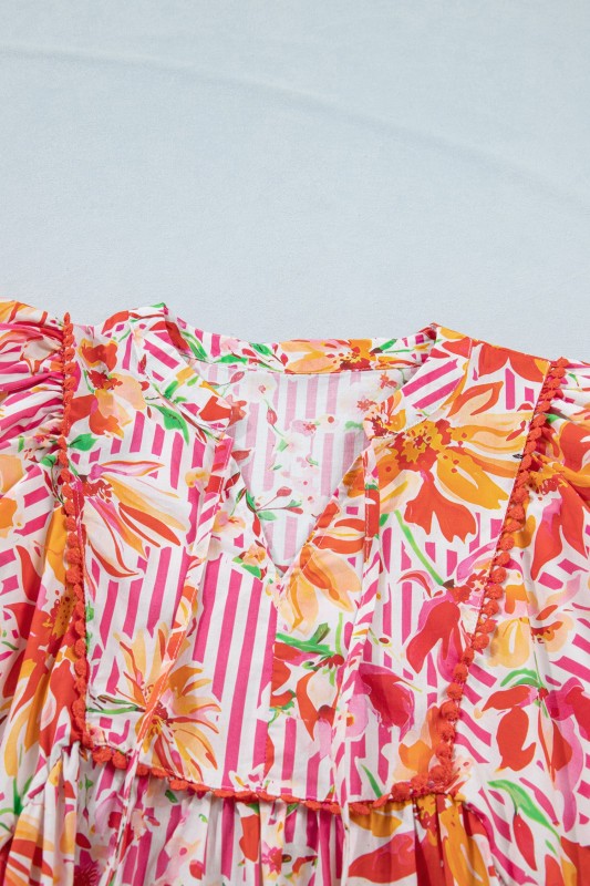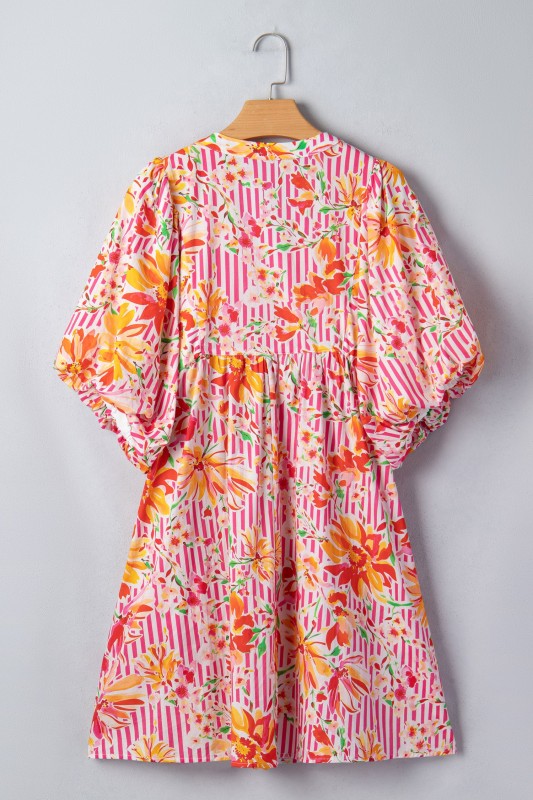 Floral Stripe Tie Neck Puff Sleeve Mini Dress
