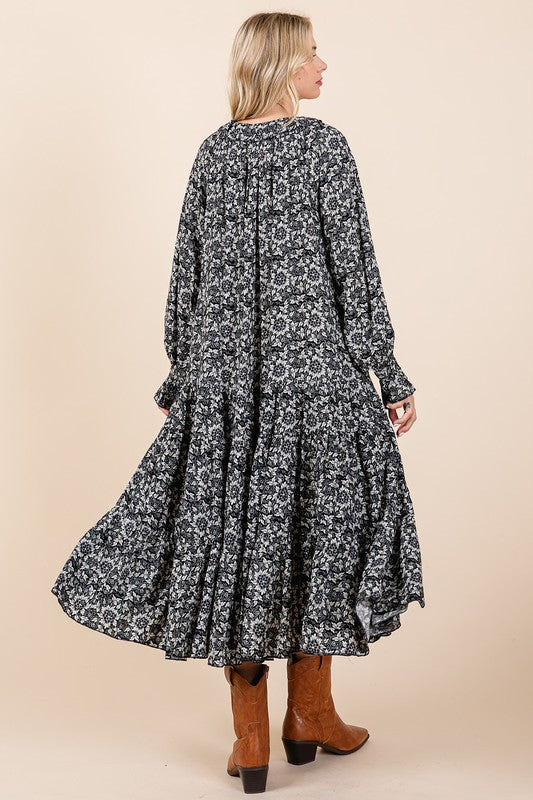 Printed Tie Neck Flounce Sleeve Midi Dress
