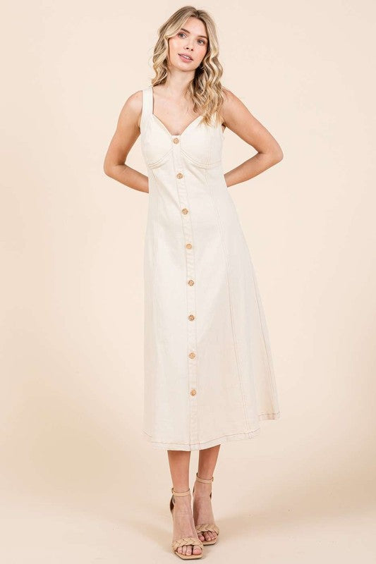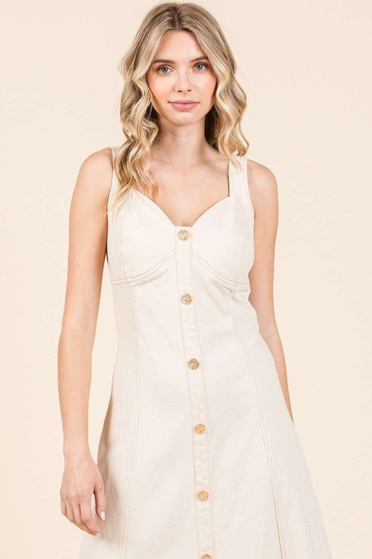 Stretch Twill Decor Button Sleeveless Midi Dress