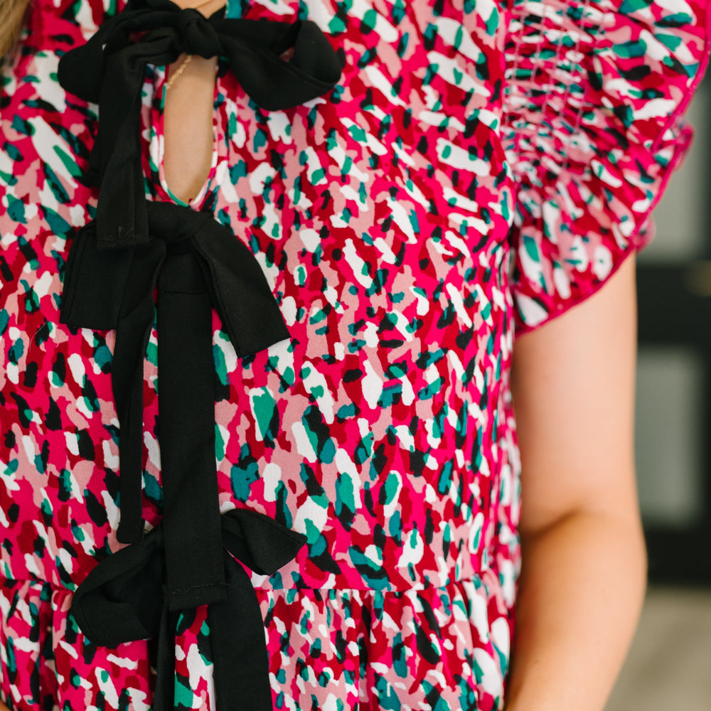 Add a splash of fun with the Pattern Pending Bow Detail Dress in vibrant fuchsia and black. Made from woven fabric with no stretch, it features a round neckline and flutter sleeves accented by smocked elastic shoulders for a flirty fit. Functional bow details and a gathered waist seam create a playful silhouette that’s perfect for making every day feel special.