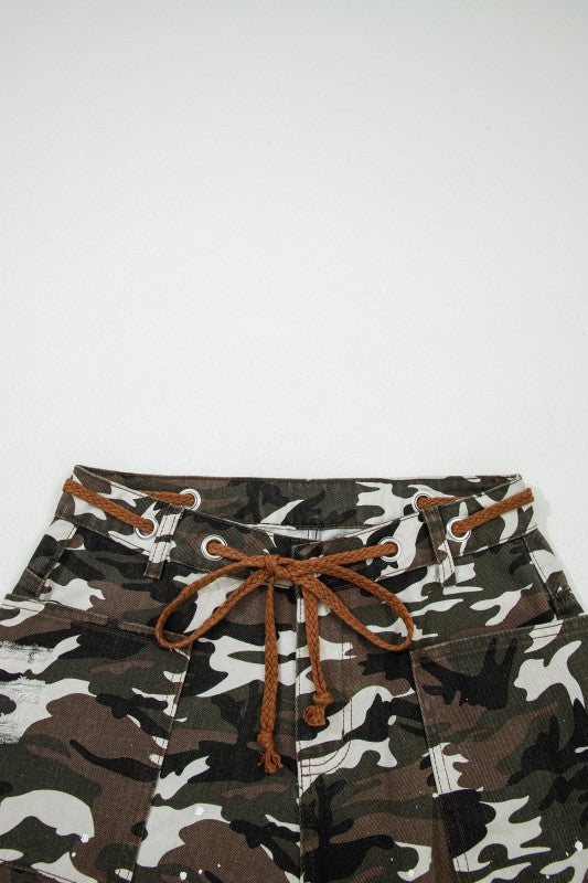 Camo Splatter Distressed Tie Waist Denim Pants