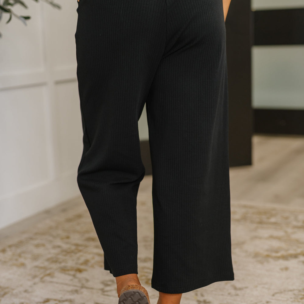 Crafted in a ribbed knit with high stretch, these Thyme Culottes pants marry comfort with contemporary style. A high-waisted rise with a cased elastic waistband ensures a secure yet flexible fit, while functional side pockets add everyday ease. Designed with a streamlined straight leg silhouette, they strike the perfect balance between laid-back and polished—ideal for lounging in style or dressing up with elevated separates.