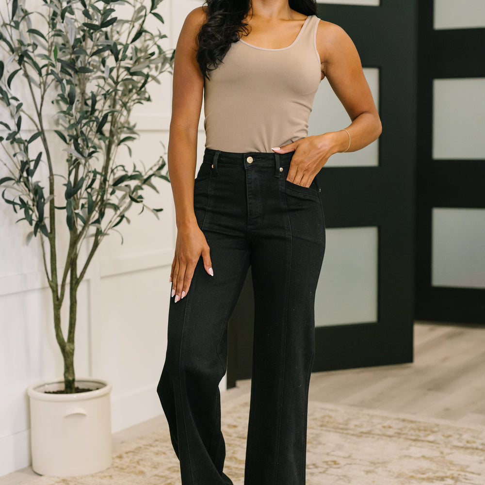Step into bold style with the Corinna High Waist Retro Wide jeans. Featuring a high-rise fit and zip fly, these dark wash jeans boast a playful retro wide silhouette that adds flair to any outfit. Crafted with 4-way stretch fabric, they promise comfort and freedom of movement all day long. Perfect for those who love a fun twist on classic denim!