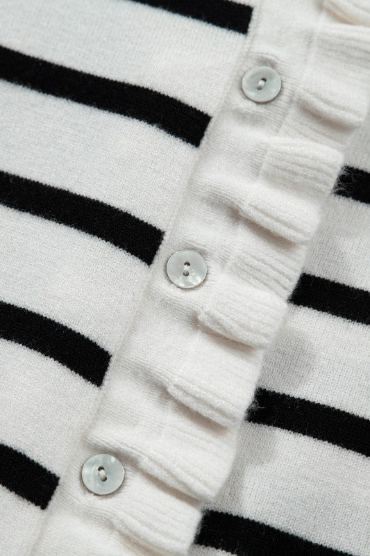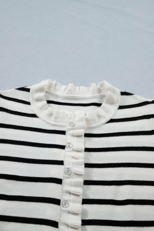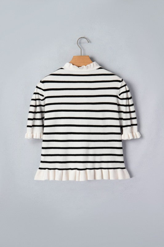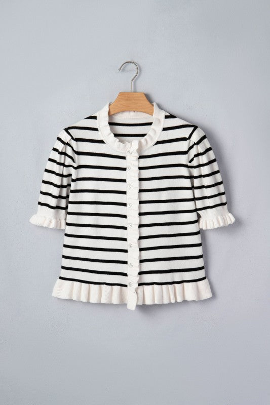 Stripe Ruffle Knit Short Sleeve Buttoned Cardigan