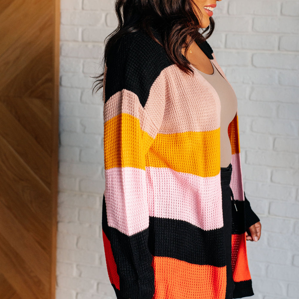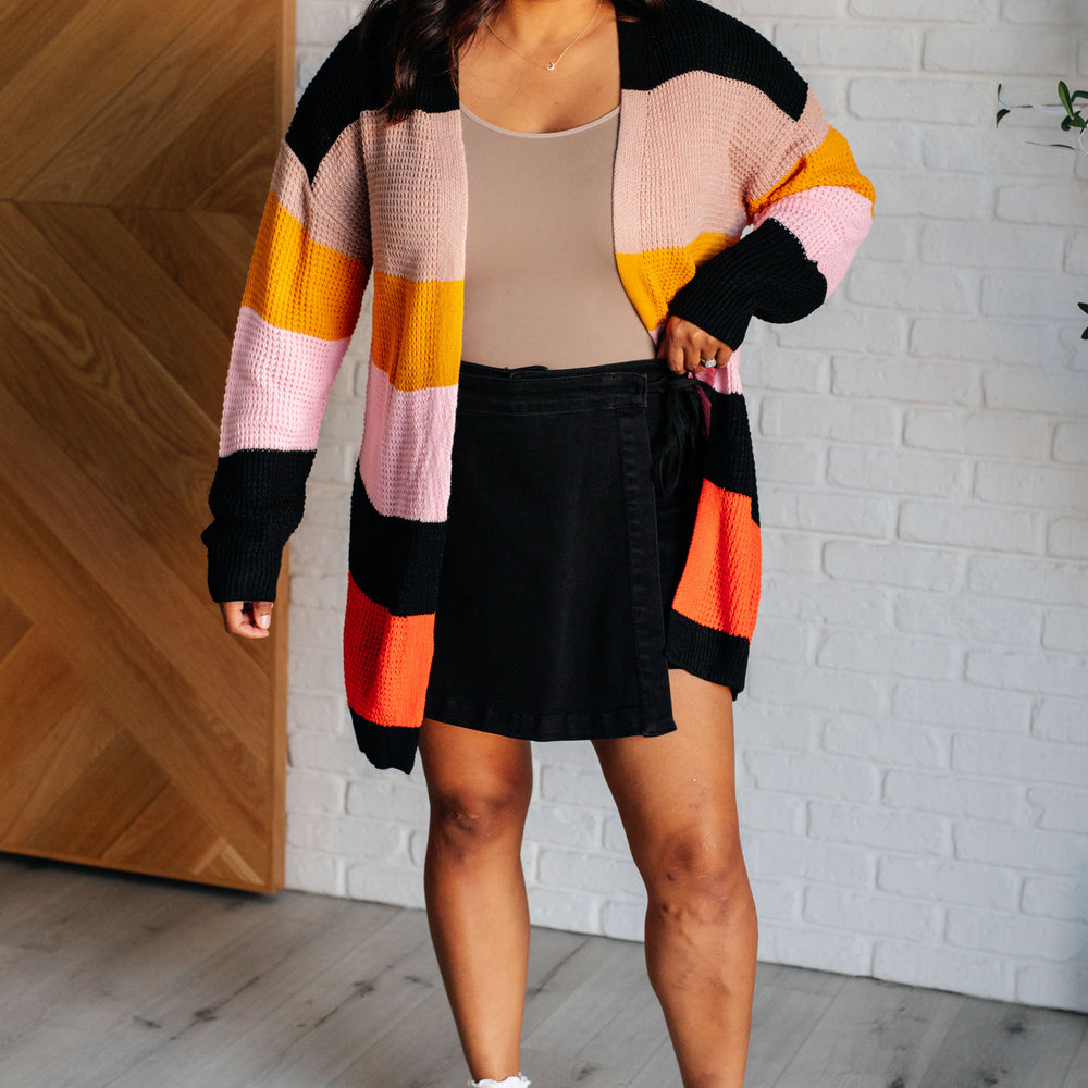 Our playful Not Quite Sure Cardigan features bold stripes and an open front design, perfect for layering when the temperatures start to drop. It features a cozy sweater knit in bold stripes, a drop shoulder for a relaxed fit, and banded ribbed cuffs and hemline for added style. It's a must-have for chilly days!