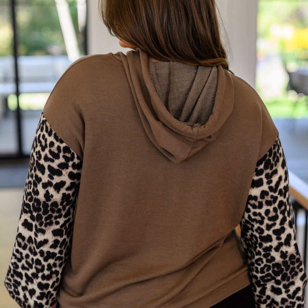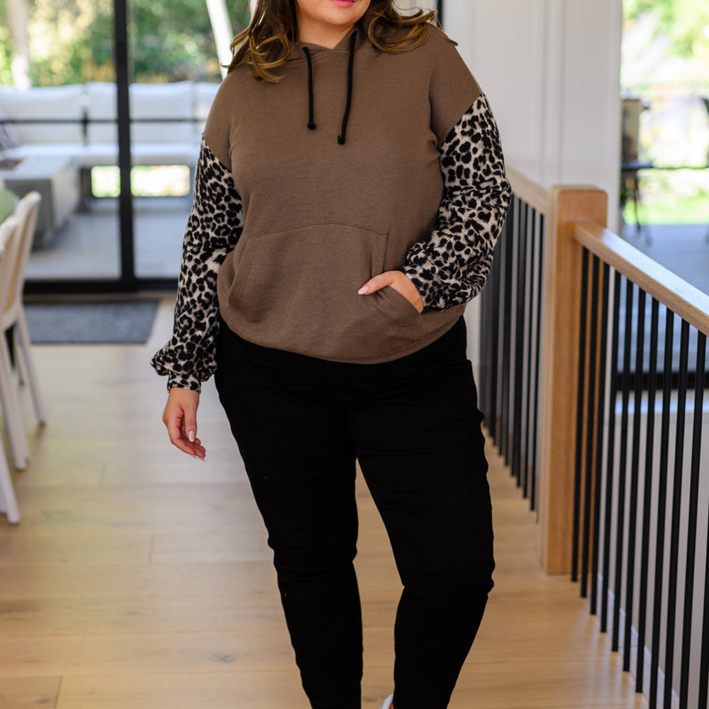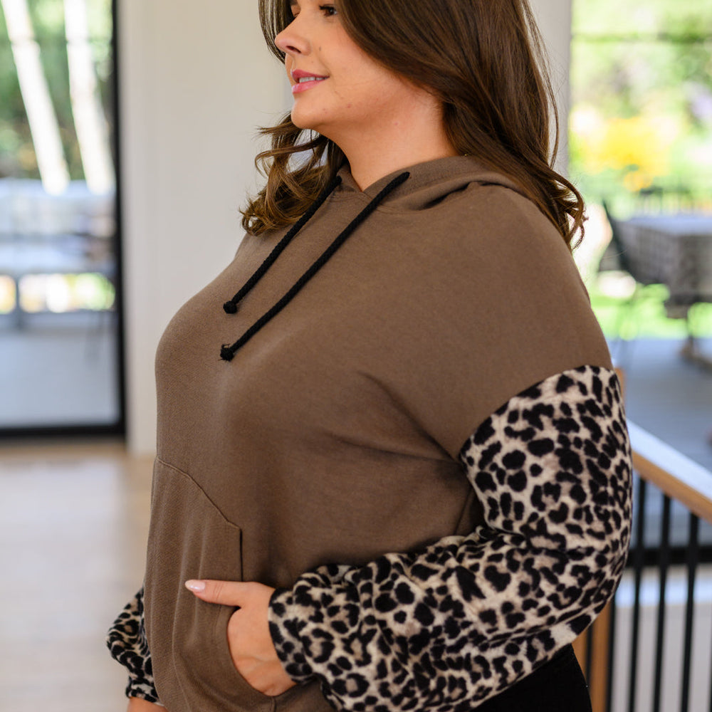 Stay comfy and on trend with the Here And There Leopard Print Hoodie. Crafted with plush french terry and features leopard print hacci sleeves and contrast drawstring, this hoodie is perfect for those days when you want to make a statement. With the kangaroo pocket, you can carry your essentials while looking stylish. Is it a stylish loungewear or a fashionable athleisure look? Here and there, you decide!