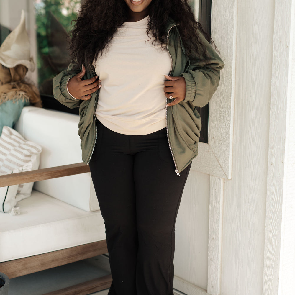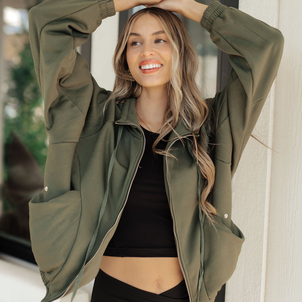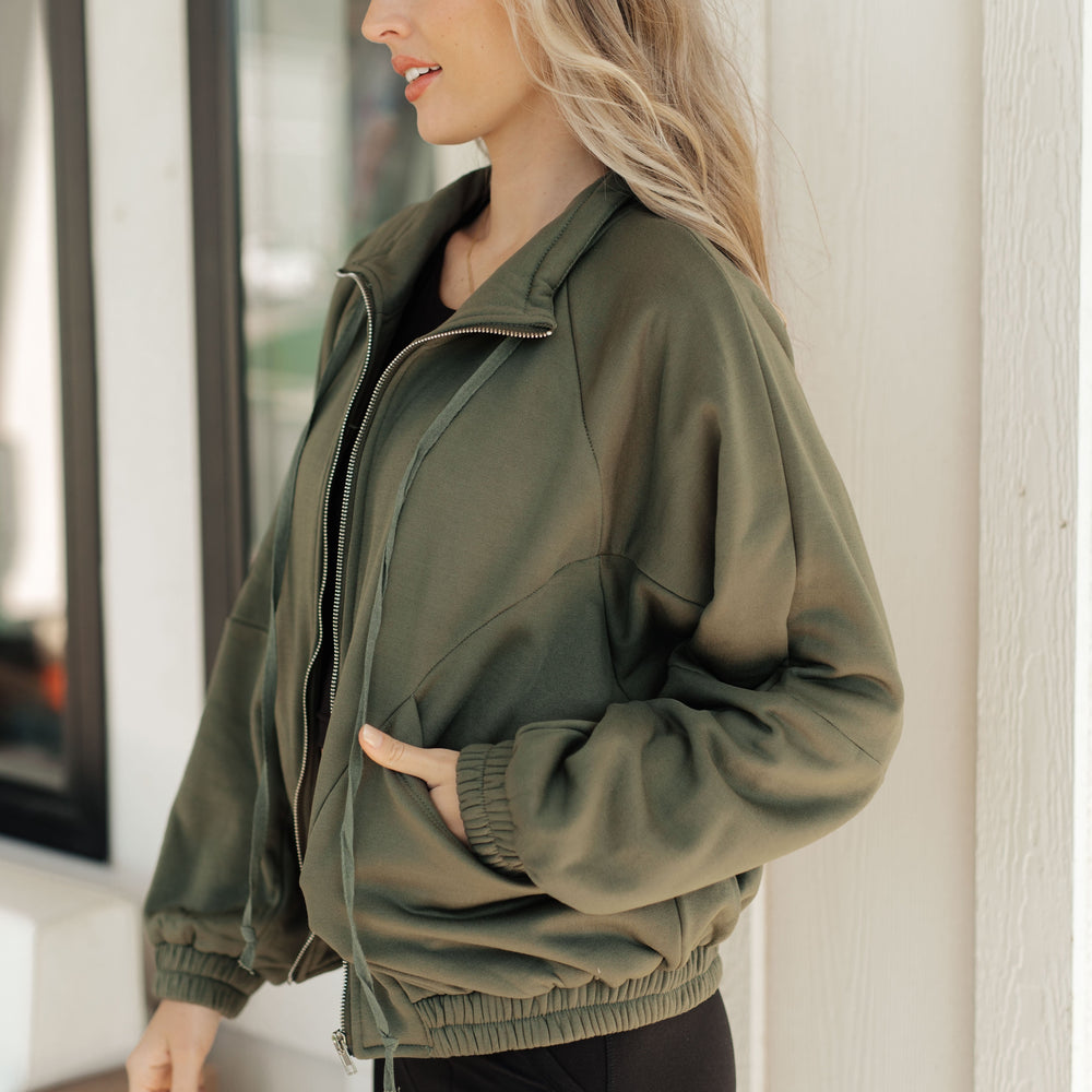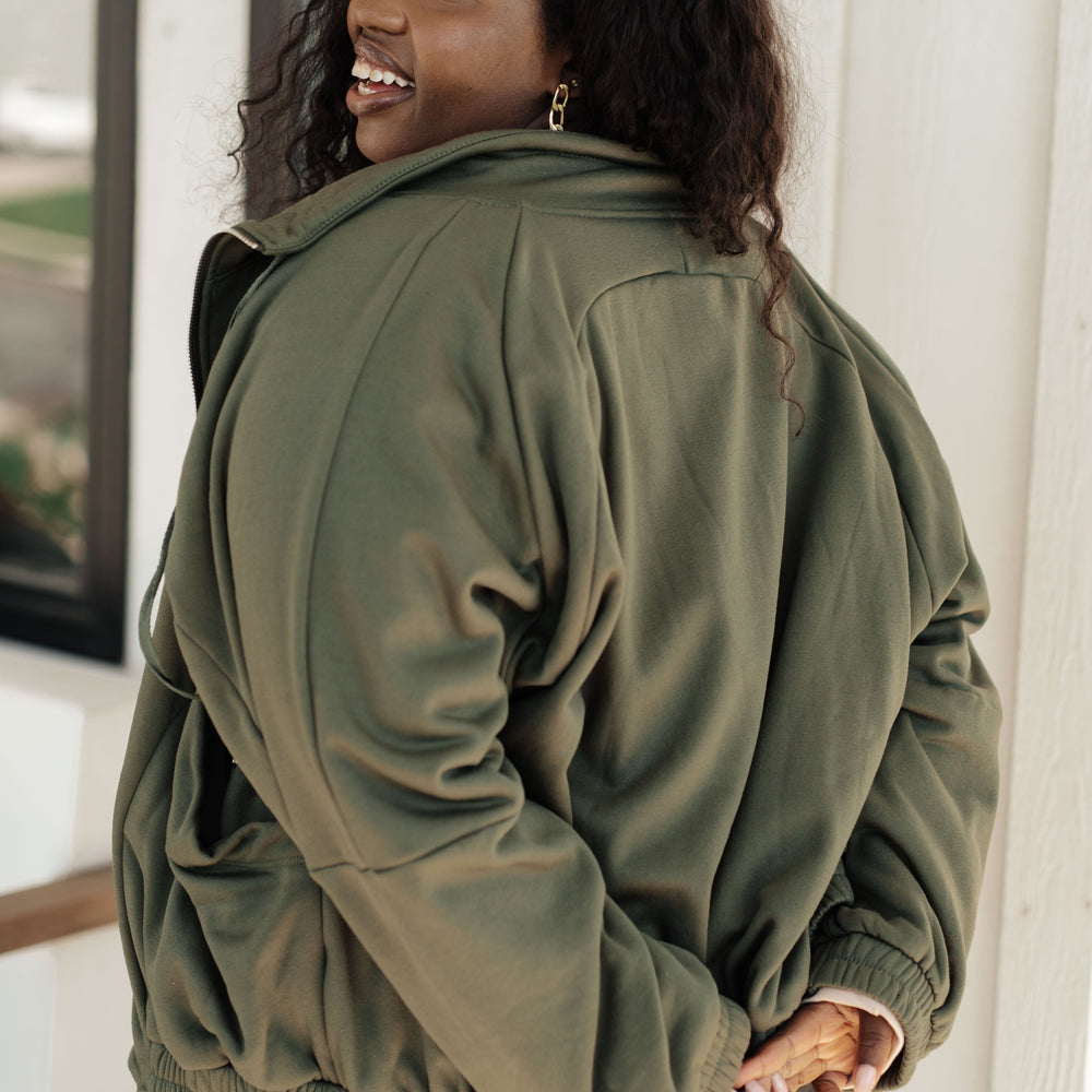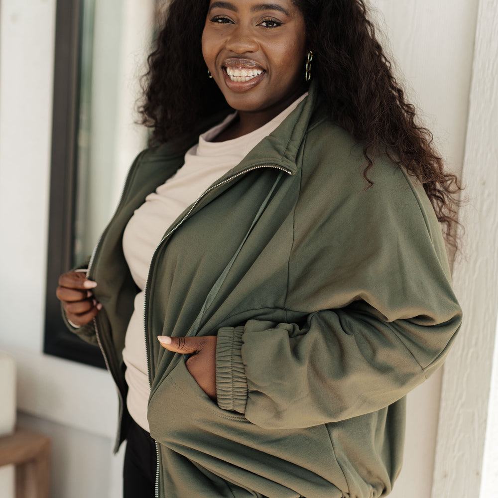 Our Miss You More Sweatshirt is the perfect way to stay warm and cozy. Featuring a high stand mock neckline, contoured seams, snap pockets and a zip front, this timeless piece is designed for a comfortable and flattering fit.