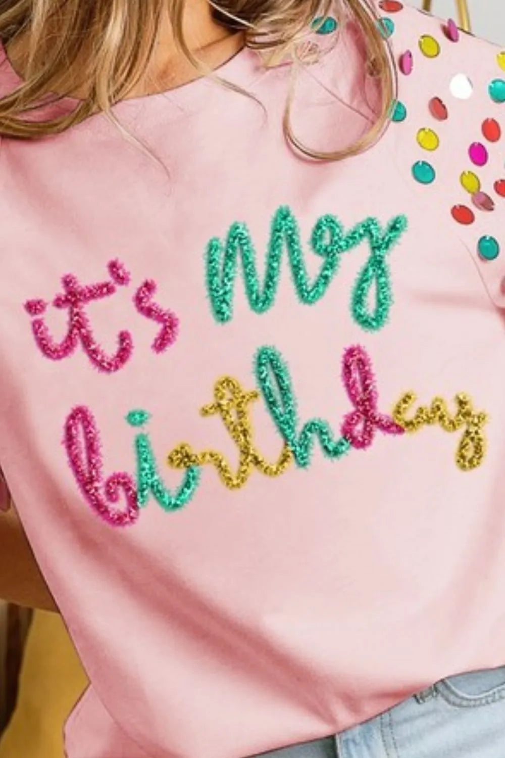 Click here to be notified by email when Metallic Letter Birthday Raglan Puff Sleeve Top - PINK / S becomes available.