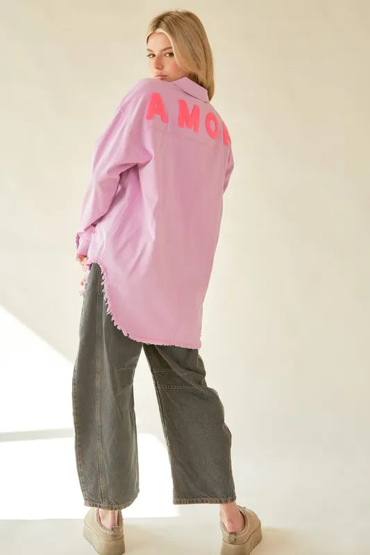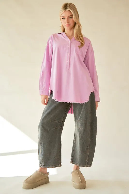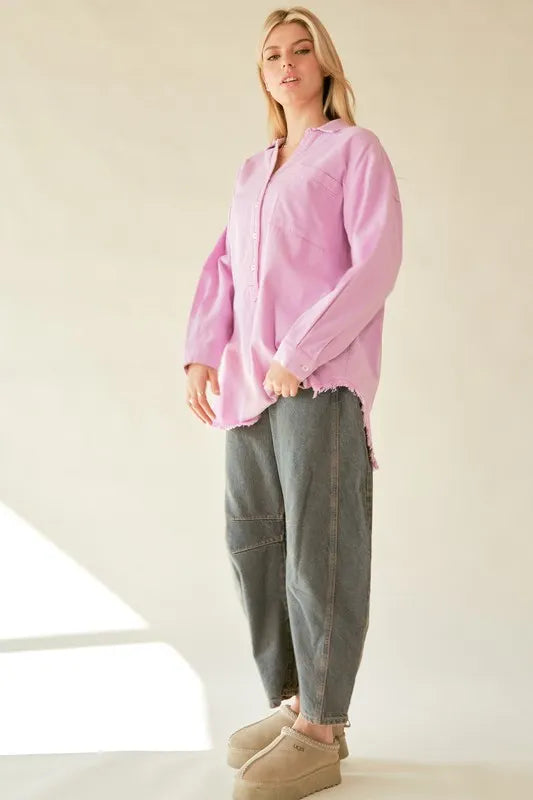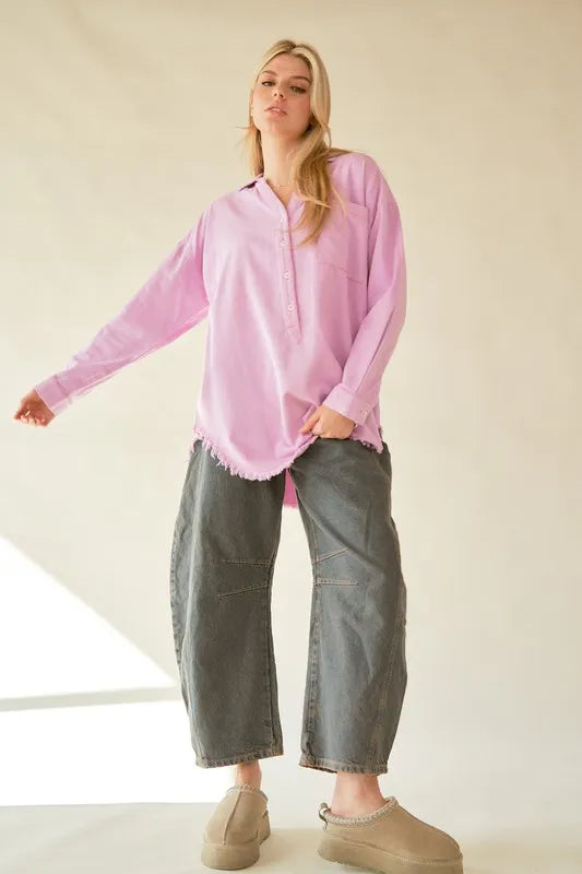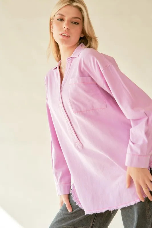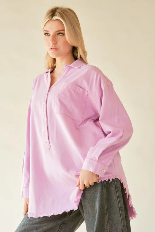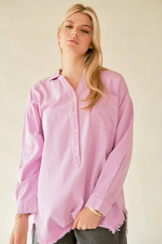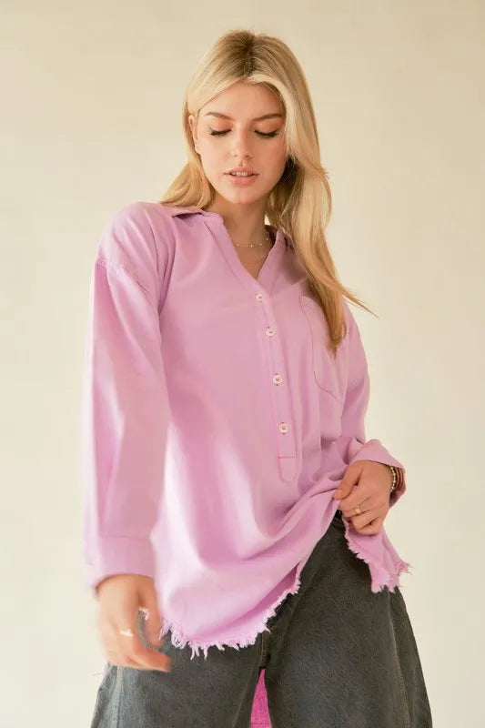 Click here to be notified by email when Letter Back Raw Hem Half Button Top - Lavender / S becomes available.