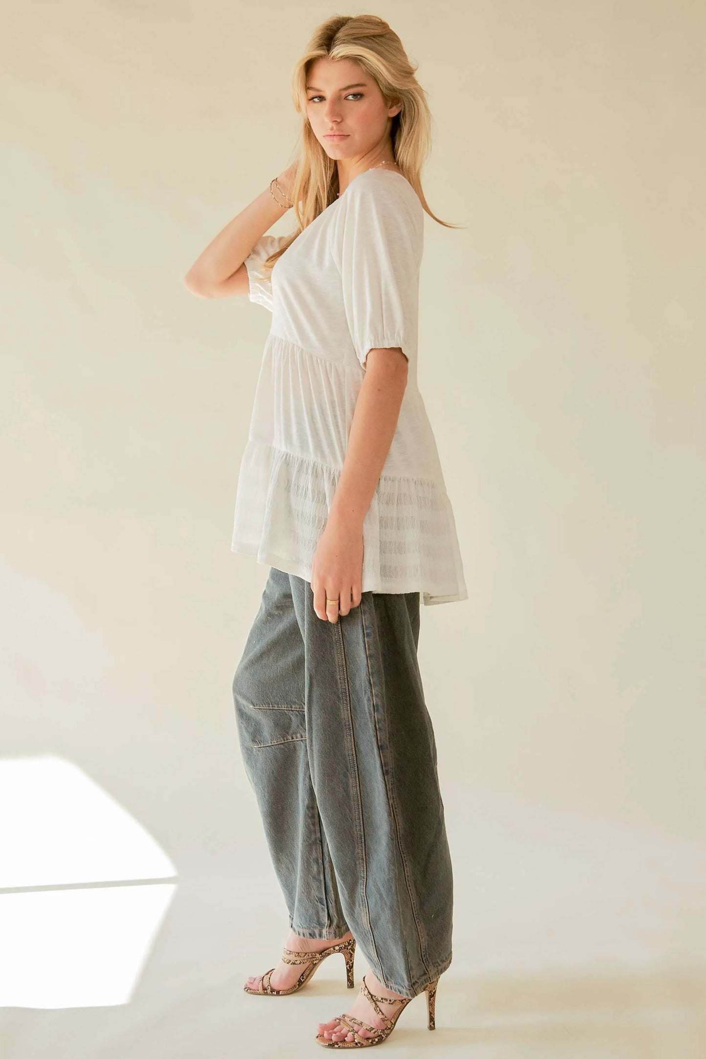 The Ruffled Flared Short Sleeve V Neck Top is a chic and feminine piece. The ruffled detailing adds a touch of elegance and movement to the design. With its flared short sleeves and V-neckline, this top offers a flattering fit. Perfect for adding a stylish flair to your outfit, this top can be dressed up or down for various occasions.