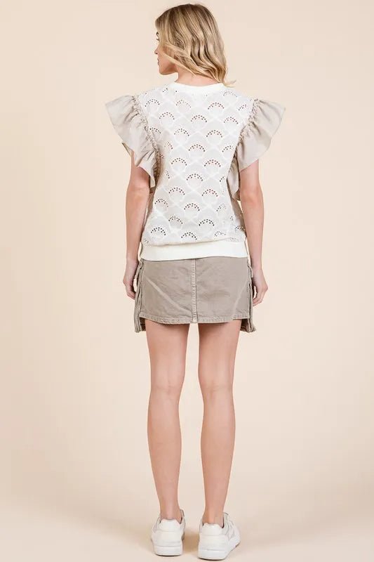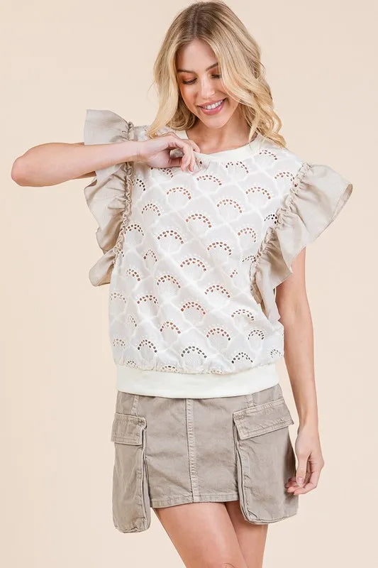 Ruffle Cap Sleeve Embroidered Eyelet Blouse