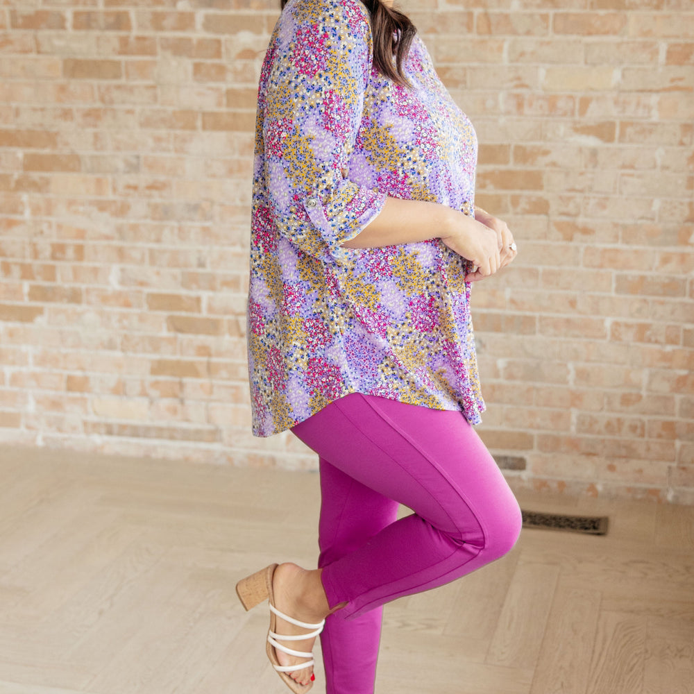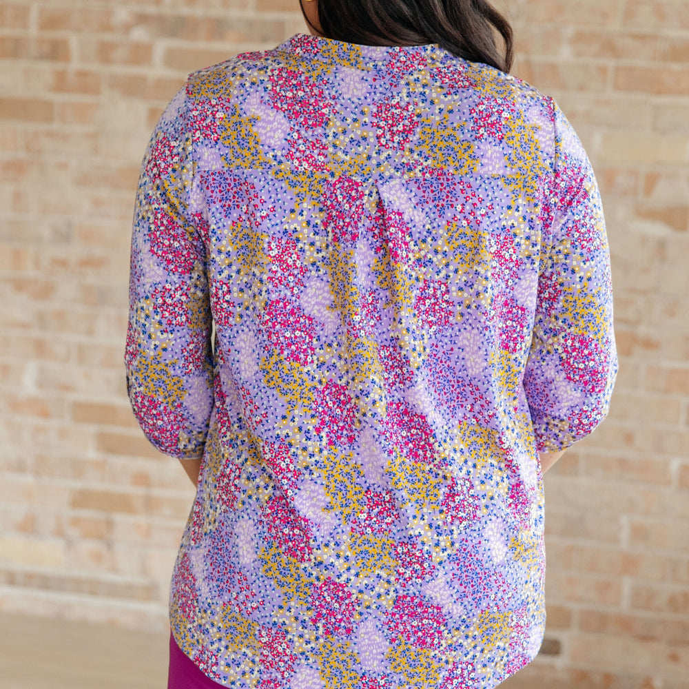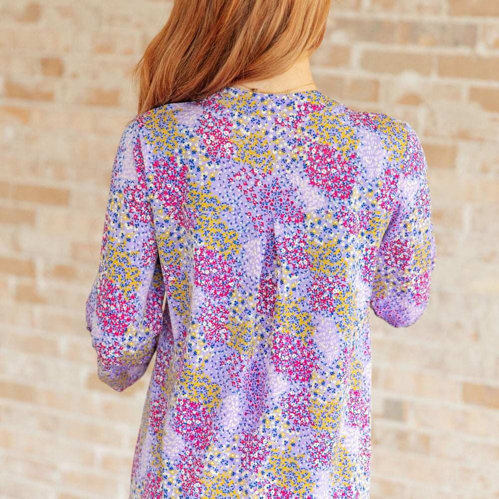 Transform your closet with the Lizzy Top in Lavender Ditsy Floral. Made from Bulgari, this top features a gabby neckline and button rolled sleeve tabs for a comfortable, yet eye-turning piece. The 3/4 sleeve and scoop hem add flow to the already stylish piece. Experience comfort and style in one with the Lizzy Top.