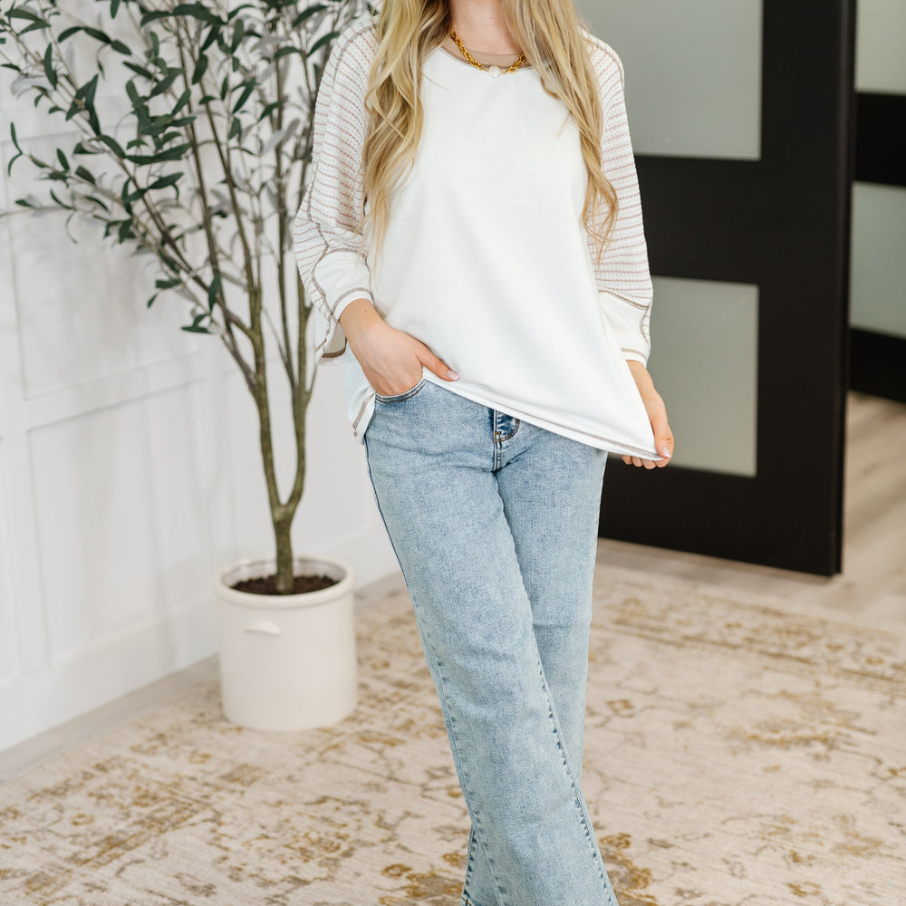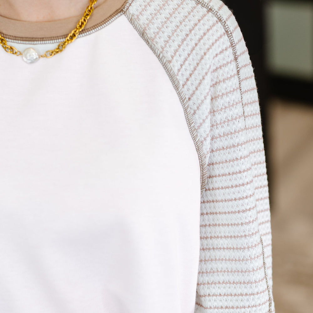 Stay comfortable and stylish with our Preoccupied Striped Sleeve Top. Made with soft French Terry fabric, this top also features sweater knit contrast details, a banded round neckline, and exposed seam details for added flair. Perfect for those who are always on the go (and look good doing it!).