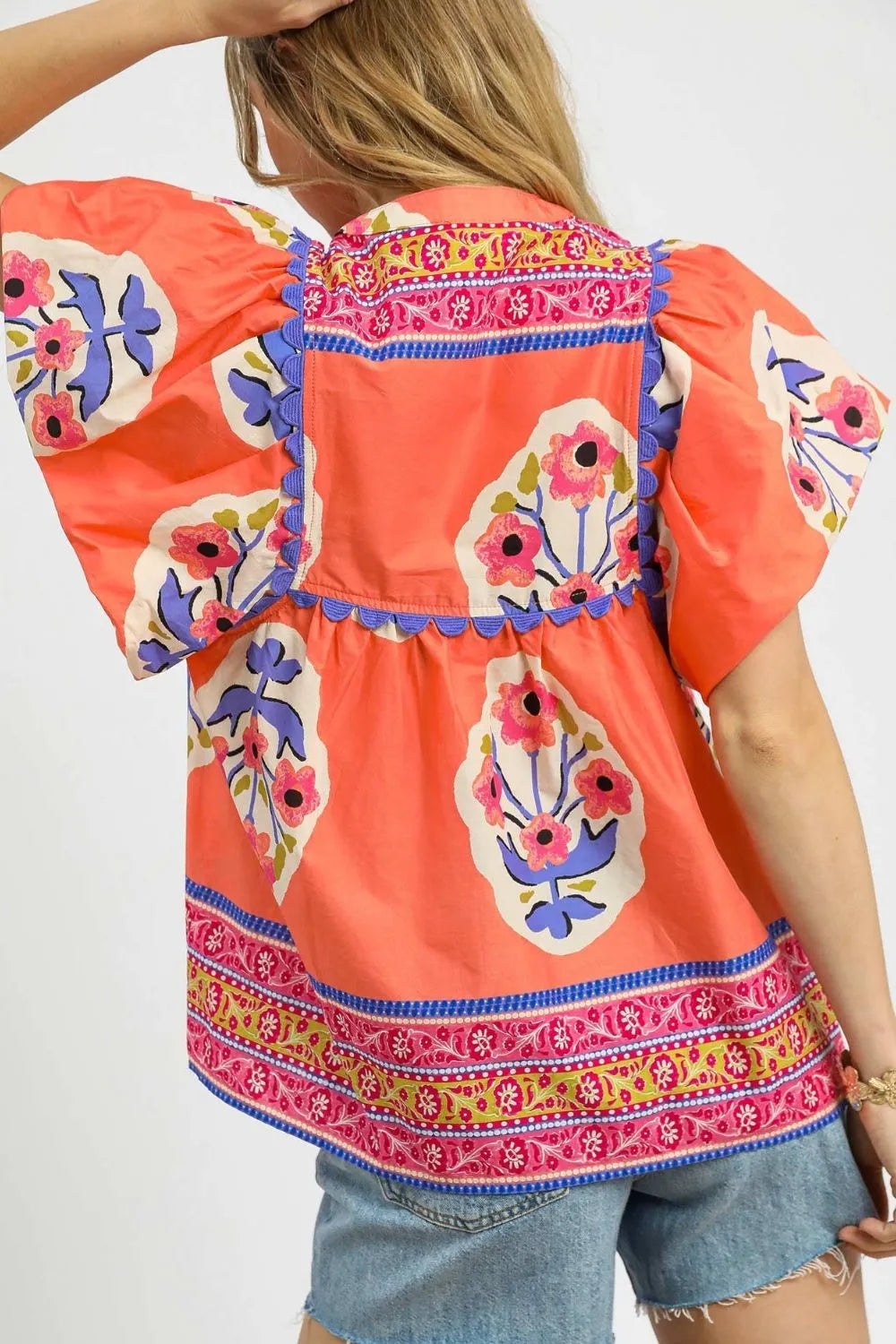 Click here to be notified by email when Floral Notched Puff Sleeve Blouse - Coral / S becomes available.