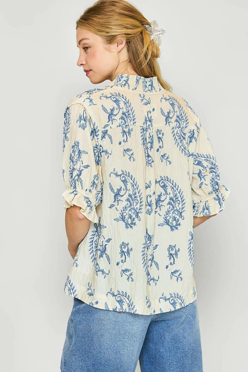 This charming blouse features a romantic blue floral toile de jouy pattern on a soft cream background, crafted from lightweight and breathable cotton-blend fabric. The sophisticated button-up design includes elegant ruffle trim details along the front placket, creating a feminine silhouette. The relaxed half sleeves with elastic cuffs offer comfort and style, while the classic collar and V-neckline add timeless appeal. Perfect for both casual outings and semi-formal occasions, this versatile piece pairs beautifully with jeans, skirts, or tailored pants. The easy-care fabric ensures lasting quality and convenience.