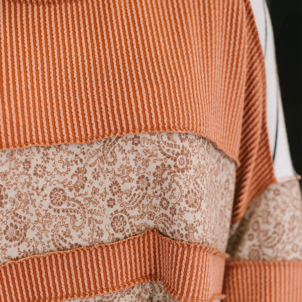The All Over the Place Color Block Relaxed Pullover mixes cozy cable ribbed knit with a soft French Terry contrast for playful texture and high stretch comfort. Its banded round neckline and drop shoulders create an easygoing vibe, while the banded, gathered sleeve cuffs and scooped hemline add fun, flirty details. Perfect for relaxed days filled with style and ease.