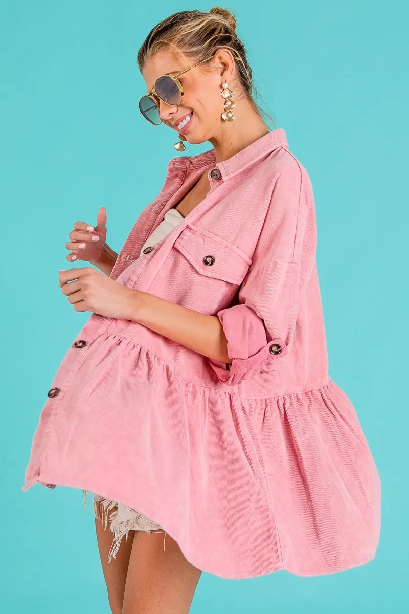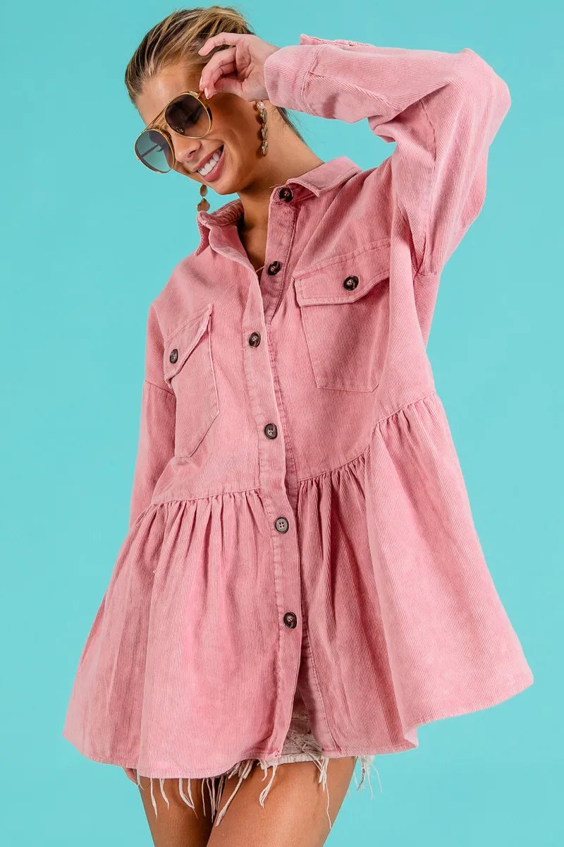 Elevate your everyday look with this Corduroy Ruffle Peplum Button Up Shirt. The ruffle peplum detail adds a feminine and stylish touch to this classic button-up shirt. Made from soft corduroy fabric, it offers both comfort and sophistication. Perfect for dressing up or down, this shirt is versatile and chic for any occasion.