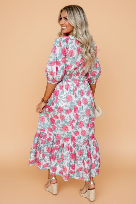 Floral Tie V-Neck Puff Sleeve Midi Dress