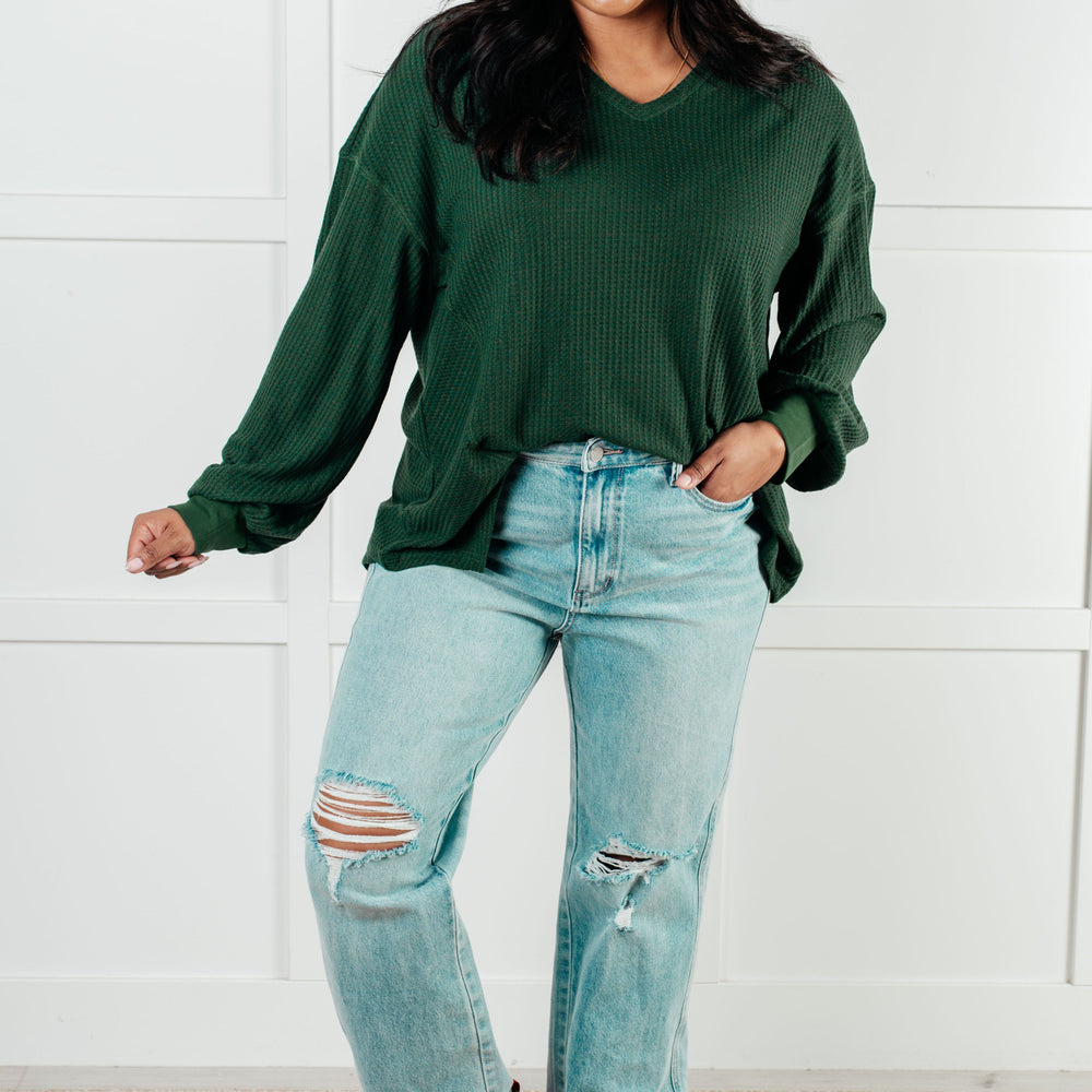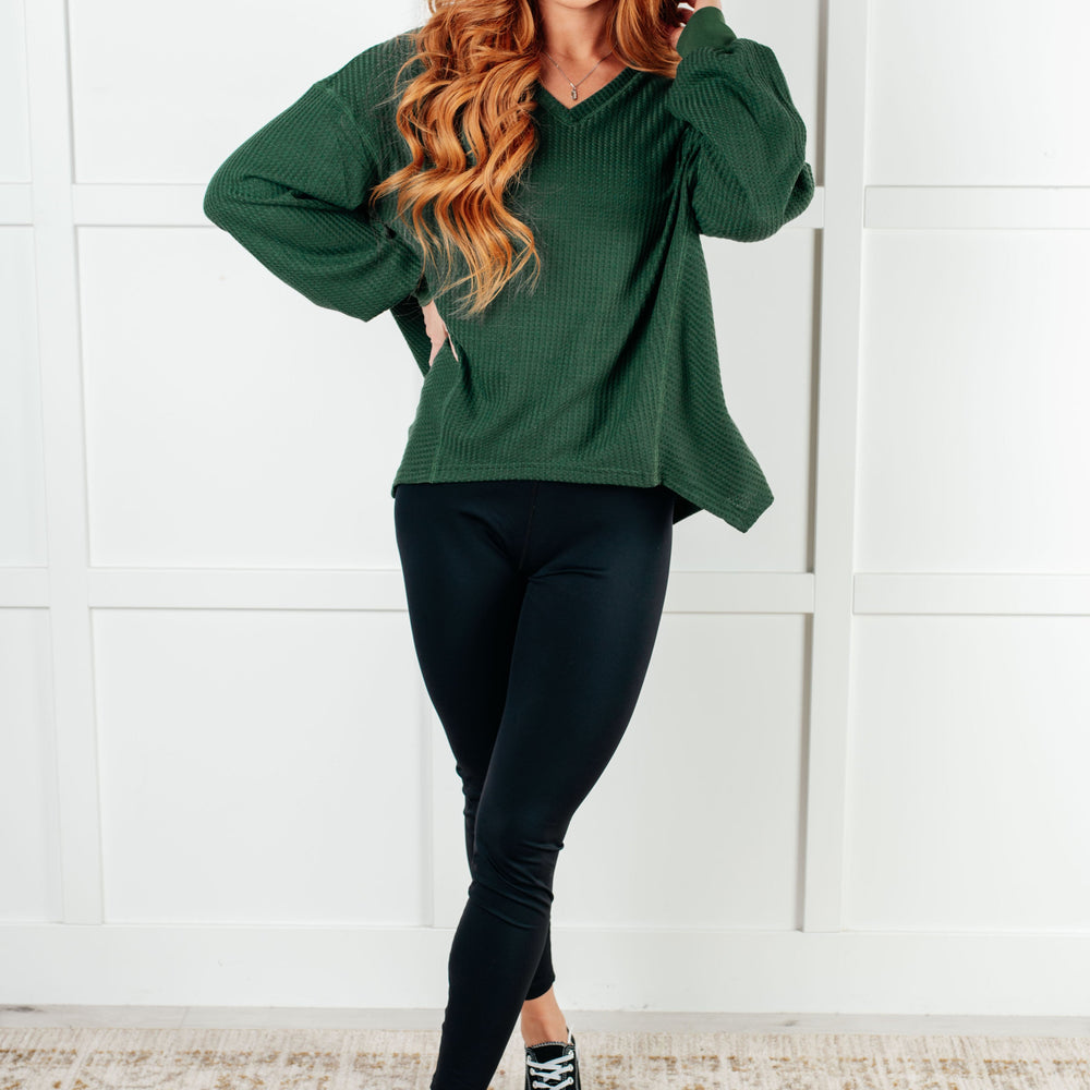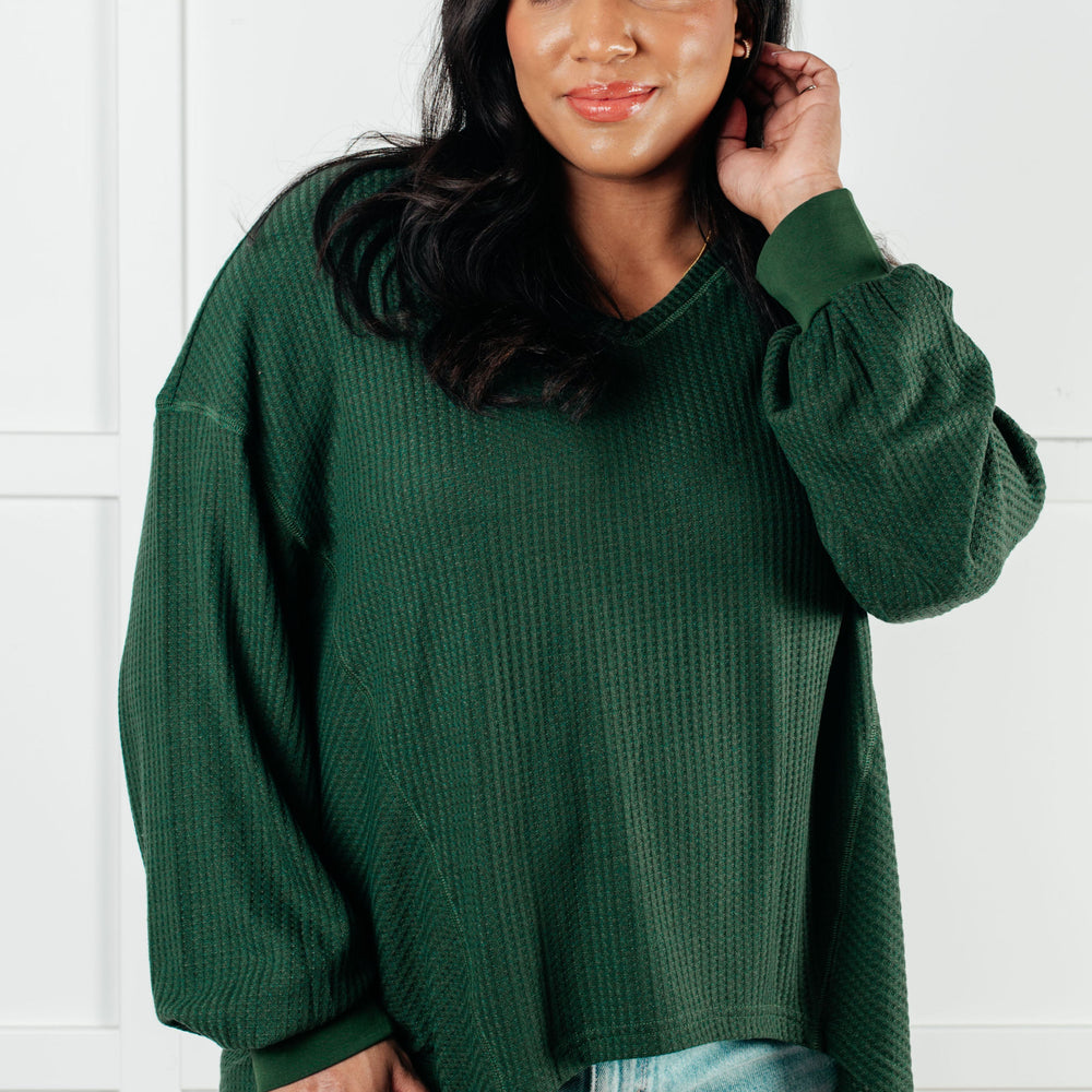 Our Good Things Are Coming V-Neck Top in Green is serving up some serious style with its v-neckline and drop shoulder silhouette. The banded sleeve cuff adds a nice touch, while the scooped asymmetrical hemline keeps things interesting. Plus, the faux tag detail is a quirky detail. Good things are definitely coming with this top.